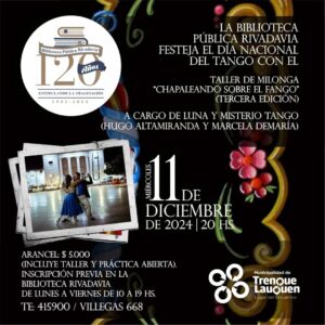Con el nombre de “Chapaleando sobre el fango”, la Biblioteca Rivadavia propone un taller de milonga (danza). La movida, gestada por la conocida pareja de bailarines Luna y Misterio compuesta por Hugo Altamiranda y Marcela Demaría, nació con la inquietud de proporcionar a los asistentes al taller “herramientas” técnicas de la danza que ayudan a expresar con el cuerpo una forma de comunicación más clara y fluida hacia el o la compañero/a de baile.