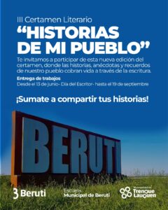La Escuela Municipal de Beruti abrió la convocatoria para el III Certamen Literario “Historias de mi Pueblo”, una propuesta que invita a recuperar la memoria colectiva a través de la escritura.