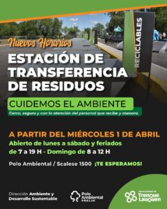 La Estación de Transferencia de Residuos, que funciona en el Polo Ambiental de Trenque Lauquen, en calle Scalese n.º 1500, cambia su horario de atención al público, que a partir del miércoles 1º de abril será de lunes a sábados y feriados de 7 a 19 h, y los domingos de 8 a 12 h.