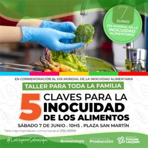 El sábado 7 de junio a partir de las 10 en la Plaza San Martín el equipo de Bromatología de la Municipalidad, que depende de la subsecretaría de Producción y Desarrollo Económico, dictará un taller didáctico con juegos para toda la familia en conmemoración del Día Mundial de la Inocuidad Alimentaria.