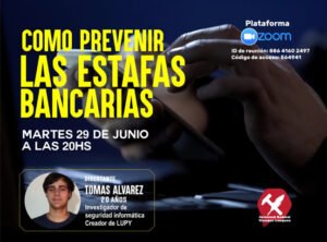 La Juventud Radical de Trenque Lauquen invita a toda la comunidad a la jornada “Como prevenir las estafas bancarias” que se llevará a cabo el día martes 29 a las 20:00, “que se realizará por la plataforma Zoom contará con la disertación del joven Trenquelauquenche Tomás Álvarez, investigador de seguridad informática y creador de LUPY, empresa que brinda asesoramiento en esta temática”, indicaron en un comunicado desde la JR.