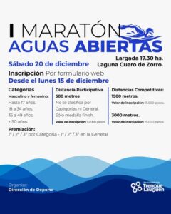 Este próximo sábado (20) a partir de las 17.30 se llevará a cabo en la laguna Cuero de Zorro la Maratón Aguas Abiertas, correspondiente a la temporada 2025/2026, organizada por la Dirección de Deporte de la Municipalidad de Trenque Lauquen.