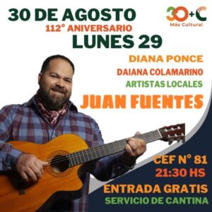 En la antesala del esperado cumpleaños, esta noche (lunes) a partir de las 21 en el CEF nº81 y con entrada libre y gratuita, un festival folclórico con artistas locales matizará la espera: actuarán Diana Ponce, Joako Divenuta, Ezequiel Rodríguez, Daiana Colamarino y Juan Fuentes.