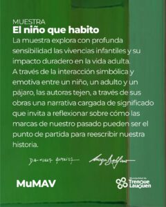 El Museo Municipal de Artes Visuales –MuMAV- inaugurará una nueva muestra llamada “El niño que habito” de las artistas Magui Delfino y Daniela Almeida, el sábado 5 de julio a las 18.