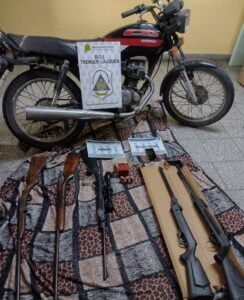 En la vivienda, los agentes hallaron dos escopetas, dos rifles de aire comprimido, una carabina y cartuchos intactos para las armas. Además, secuestraron una moto.