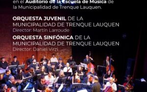 En una nueva propuesta cultural para la comunidad de Trenque Lauquen, el próximo sábado a partir de las 20 en el auditorio de la Escuela Municipal de Música se presentarán en concierto la Orquesta Sinfónica Municipal, que dirige el maestro Daniel Virzi y la Orquesta Juvenil Municipal, dirigida por Martín Larroudé.