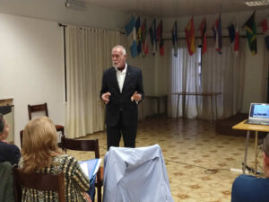 Alto, de pómulos prominentes, barba cuidada, y algunos detalles gauchescos, fiel al tradicionalismo que cultiva con fervor, camisa blanca y traje oscuro, Ricardo Péculo se pasea ante una treintena de ávidos oídos locales y de la región, ofreciendo una charla más de las tantas que realiza desde hace décadas a lo largo de toda la geografía argentina.