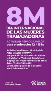 Además, comentó que “el 20 de marzo, en articulación con profesionales de la Residencia de Medicina General, en el CAPS Ramón Carrillo se dictará el taller de “Gestión menstrual, prevención cáncer de cuello uterino y métodos anticonceptivos”, y como cierre de las actividades el 22 de marzo, a las 17 habrá una charla en el Museo Municipal de Artes Visuales –MUMAV- a cargo de la Licenciada en Gestión de Recursos Humanos, Gisela Riveiro Oyarzábal, investigadora del área de Desigualdad de Género del Centro de Estudios Atenea, quien es oriunda de Trenque Lauquen pero actualmente reside en Capital Federal”.