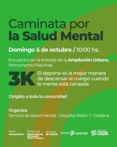 -A las 10 horas en la Ampliación Urbana/Caminata por la Salud Mental/Encuentro en la entrada de la Ampliación Urbana /Monumento Malvinas). Organizan: Servicio de Salud Mental y Hospital Municipal Dr. Pedro T. Orellana