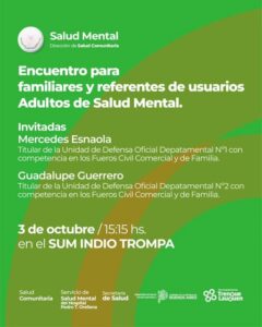 -15.15 horas en el SUM Indio Trompa/ Encuentro para familiares y referentes de usuarios adultos de salud Mental. Invitadas: Mercedes Esnaola (titular de la Unidad de Defensa Oficial del Departamental nº 1 con competencia en los Fueros Civil Comercial y de Familia
