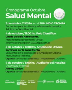 La propuesta de la Municipalidad de Trenque Lauquen incluye talleres, charlas, una caminata, un ateneo clínico y otras acciones con el objetivo de visibilizar los dispositivos que funcionan en el distrito para brindar apoyo, contención y acompañamiento a quienes lo necesitan, además de crear conciencia sobre los problemas de salud mental y movilizar esfuerzos en su defensa.