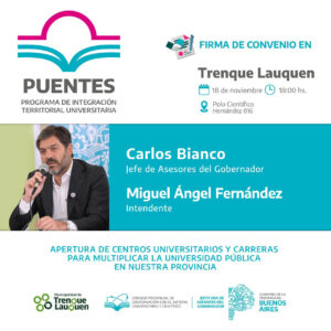 El intendente municipal, Miguel Fernández, y el Jefe de Asesores del Gobierno de la Provincia de Buenos Aires, Carlos Bianco, firmarán el convenio de adhesión de Trenque Lauquen al Programa de Integración Territorial Universitaria (PUENTES), en un acto a realizarse mañana (viernes) a partir de las 18.30 en el polo Científico Tecnológico (PCT), en calle Hernández 816.