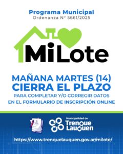 La Municipalidad de Trenque Lauquen recuerda que mañana (martes 14) –a la medianoche- vence el plazo para corregir, subsanar y/o completar la información del formulario de inscripción online del Programa Municipal Mi Lote, una iniciativa destinada a personas y familias que buscan acceder a un terreno para la construcción de su vivienda única y permanente aprobada mediante la Ordenanza 5661/2025.