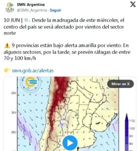 El Servicio Meteorológico Nacional (SMN) emitió en las últimas horas una alerta amarilla por vientos fuertes que afectará a distritos bonaerenses durante las jornadas del miércoles y jueves, situación que podría ser severa en algunas zonas, aunque por fortuna, sin advertencia de lluvias. El oeste bonaerense, de norte a sur, se verá afectado por la prevalencia del viento norte, que podría presentar ráfagas “de entre 70 y 100 km/h”.