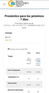 el Servicio Meteorológico Nacional (SMN) había anunciado para este fin de semana, acorde con el comienzo del invierno astronómico, el ingreso de una masa de aire frío desde la Patagonia, provocando un gran descenso de la temperatura en las provincias del sur y, paulatinamente, en el centro y norte del territorio nacional.