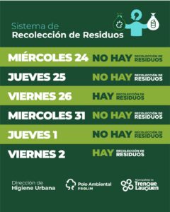La Dirección de Higiene Urbana de la Municipalidad de Trenque Lauquen, a cargo de Néstor Cóccaro, informa que, con motivo de las celebraciones de las fiestas de Navidad y Año Nuevo, no habrá recolección de residuos domiciliarios los días 24 y 25 de diciembre, ni 31 de diciembre y 1° de enero, por los asuetos administrativos y feriados correspondientes.