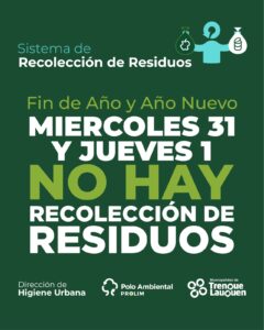 La Dirección de Higiene Urbana de la Municipalidad de Trenque Lauquen, a cargo de Néstor Cóccaro, recuerda que, con motivo de las celebraciones de las fiestas de Año Nuevo, no habrá recolección de residuos domiciliarios los días 31 de diciembre y 1° de enero, por los asuetos administrativos y feriados correspondientes.