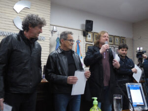 El presidente del HCD, Alberto Rodríguez Mera, los concejales Ariel Troya, Pablo Larrosa y el secretario Administrativo del Concejo, Pedro Márquez, hicieron entrega de una copia del Decreto sancionado por el Cuerpo Legislativo que declaró de Interés Cultural la trayectoria del Aleman Grup, una banda icónica en la historia del rock de Trenque Lauquen integrada por Raúl Arbelbide (bajo, guitarras lead), Osvaldo “Loco” Sierra (batería), Walter Ledesma (saxos, coros) y Jorge “Alemán” Azpiroz (voz, guitarras).