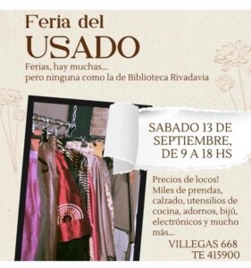 La Biblioteca Pública Rivadavia realizará este sábado 13 de septiembre una nueva edición de la popular Feria del Usado, en las que ofrecerá una enorme cantidad de prendas seleccionadas (de la temporada primavera-verano) y muchos otros artículos interesantes a precios bajísimos, como es la característica de las ferias americanas que se hacen en Villegas 668.