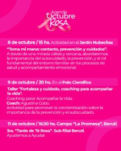 Asimismo, adelantó que “el 15 de octubre habrá una actividad en el Centro Cultural de Beruti, el 18 de octubre, la Gran Zumba Rosa en Plaza San Martin; como el año pasado vamos a tener la realización de mamografías en el Hospital Municipal incluyendo también a las mujeres de Beruti y 30 de Agosto”.
