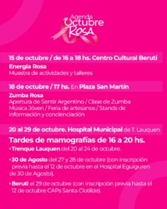 Bajo el lema “Unidos por la singularidad”, y durante todo octubre, Mes de la Concientización sobre el Cáncer de Mama, conocido popularmente como Mes Rosa, -color utilizado por personas y organizaciones para generar conciencia- la Municipalidad de Trenque Lauquen, junto a instituciones y vecinos/as de la comunidad organizan diferentes actividades y propuestas con el objetivo de promover la detección precoz, el tratamiento y los cuidados paliativos en torno a esta enfermedad.