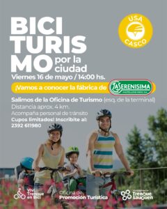 El viernes 16 de mayo a partir de las 14 se realizará una nueva jornada de Biciturismo por la ciudad, una propuesta impulsada por la Oficina de Promoción Turística del Municipio que en esta oportunidad incluye una visita a la planta láctea La Serenísima, ubicada en Sector Industrial de Trenque Lauquen.