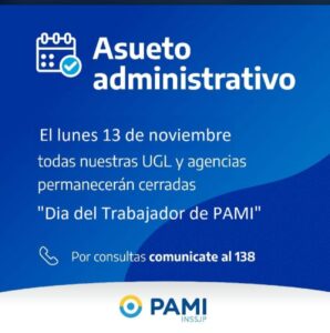 El Programa de Atención Médica Integral (PAMI) informó que este lunes 13 de noviembre sus oficinas permanecerán cerradas, por lo que no habrá atención al público.