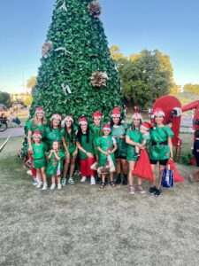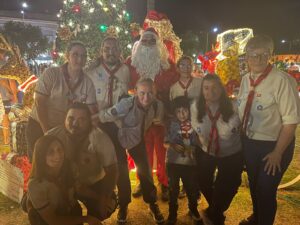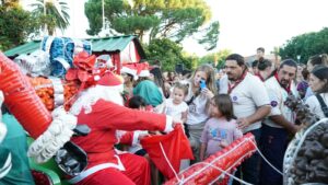 Integrantes del grupo Scout Conrado Villegas acompañaron a Papá Noel en la recorrida y colaboraron en la organización de los chicos/as, a subirlos al trineo y a sacarse fotos.