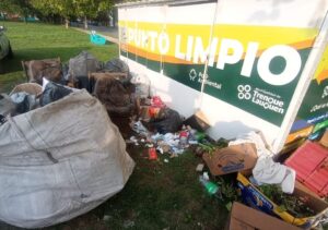 A pocos días de haber sido instalado y en un hecho que genera mucha impotencia e indignación, gran cantidad de basura apareció desparramada en el suelo y en el techo del Punto Limpio ubicado en Ugarte y Alberdi, uno de los sectores de la Plazoleta Almirante Brown, lugar donde tradicionalmente funciona la Feria Ecofines y los puestos gastronómicos.