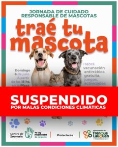 Por pronóstico de lluvias y mal tiempo para este domingo (6), se suspendió la Jornada de Cuidado Responsable de Mascotas, organizada por la dirección de Zoonosis municipal y las asociaciones UPA, UPM (Unidos por Mascotas) y protectoras independientes.