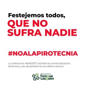 Con el objetivo de pasar las fiestas navideñas y de fin de año en armonía, en comunidad y siendo solidarios y empáticos con las personas que sufren los efectos de las explosiones o estallidos que produce la pirotecnia, la Municipalidad de Trenque Lauquen recuerda que sigue vigente la Ordenanza que prohíbe la venta, compra y utilización de pirotecnia sonora en nuestro distrito.