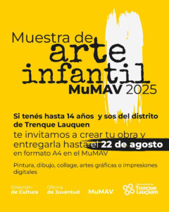 La Oficina de Juventudes del municipio y el Museo Municipal de Artes Visuales –MUMAV- informan que la convocatoria para participar de las dos iniciativas destinadas a la comunidad joven del distrito de Trenque Lauquen: el Premio Arte Joven y la Muestra de Arte Infantil se extendió una semana, hasta el viernes 22 de agosto.