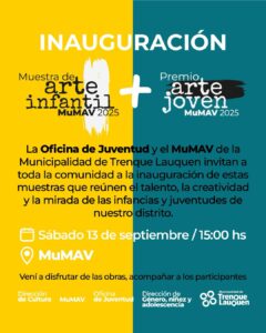 Hoy a las 15, el Museo Municipal de Artes Visuales (MuMAV) -Wilde 10 bis- abrirá sus puertas para la inauguración del Premio de Arte Joven y la Muestra de Arte Infantil 2025, que estará en exhibición durante los meses de septiembre y octubre del 2025.