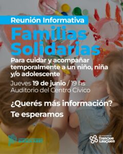 La Dirección de Género, Niñez y Adolescencia de la Municipalidad de Trenque Lauquen y el Servicio Zonal de Promoción y Protección de los derechos de Niños y Adolescentes de la provincia de Buenos Aires invitan a una reunión informativa para dar a conocer los detalles y alcances del Programa “Familias Solidarias”, una herramienta de acompañamiento y sostén que busca ofrecer una alternativa de cuidado a niños, niñas y adolescentes que, por alguna razón y de manera circunstancial, dejan de convivir con su familia de origen.