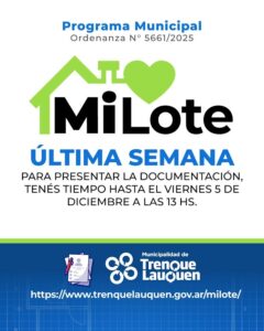 Las personas pre-adjudicatarias favorecidas como titulares en el sorteo público realizado con el padrón definitivo del programa municipal Mi Lote deben presentar la documentación solicitada por la Municipalidad de Trenque Lauquen para luego ser verificada por las áreas correspondientes, siendo éste el paso previo obligatorio a la adjudicación definitiva, conforme lo establecido por la Ordenanza N° 5661/2025.