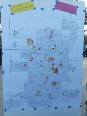 Utilizando stickers como señaladores de amor y cuidado, varios vecinos ubicaron en el plano de la ciudad los lugares que respondían a las preguntas ¿Cuál es el lugar qué más amas de TL? y ¿Cuál es el lugar que deberíamos proteger? El mapa intervenido es el primero de muchos que se espera reunir y analizar.