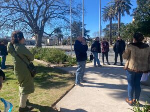 El sábado en la Plaza San Martín, se realizó la tercera de las actividades enmarcadas la Semana del Árbol: fue una recorrida arbórea guiada, a cargo de la directora de Espacios Verdes, Germana Cuniberti, compartida con un grupo de vecinos/as entre los que se encontraban dos historiadoras locales, Haydeé Merino y María Inés Micheo.