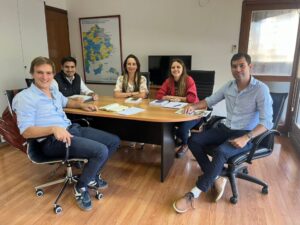 El secretario de Gobierno Martín Borrazas y el director de Abordaje Territorial Francisco Martínez, acompañados por el diputado provincial Valentín Miranda, mantuvieron un encuentro con la subsecretaria de Políticas Sociales Bernarda Meglia Vivares y la directora de Intervenciones Complementarias Erica Osterrieth del Ministerio de Desarrollo de la Comunidad de la provincia de Buenos Aires.