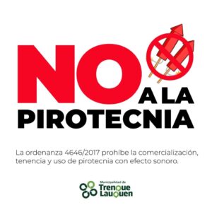 La Municipalidad de Trenque Lauquen recuerda que sigue vigente la Ordenanza que prohíbe la venta, compra y utilización de pirotecnia sonora en nuestro distrito, y en este sentido apela a la solidaridad de los vecinos/as para evitar que las personas y las mascotas sufran por los efectos de las explosiones.