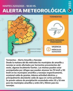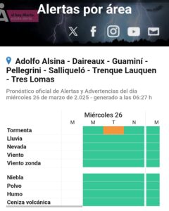 El Servicio Meteorológico Nacional (SMN) emitió alertas de nivel naranja por lluvias y tormentas para Trenque Lauquen y toda un área que ocupa gran parte del territorio de la provincia de Buenos Aires.