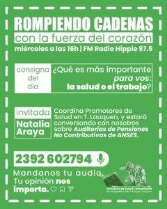 Hoy miércoles a las 16 horas, el taller de radio Rompiendo Cadenas que depende de la Dirección de Salud Comunitaria del Municipio, retoma su espacio habitual en Radio Hippie 97.5, con una nueva emisión que invita a la reflexión. La consigna del día será: “¿Qué es más importante para vos: la salud o el trabajo?”, y los oyentes podrán participar enviando sus audios al 2392-602794.