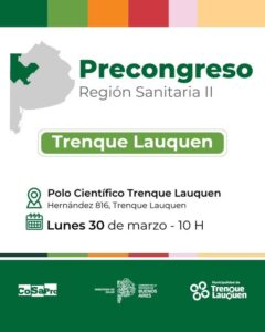 El próximo lunes (30) a partir de las 10 h en la sede del Polo Científico Tecnológico Municipal –Hernández n.º 816- se realizará el PreCosapro 2026 – Región Sanitaria II, antesala del Congreso Provincial de Salud (CoSaPro), programado para el 15, 16 y 17 de abril en Mar del Plata.