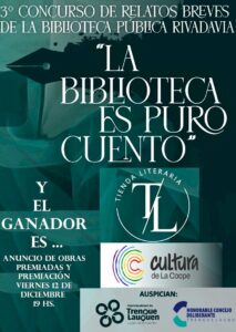 El próximo viernes 12 de diciembre a las 19 hs la Biblioteca Rivadavia develará los nombres de los ganadores del 3º Concurso de Relatos Breves “La Biblioteca es puro cuento” que este año recibió un número impensado de obras y escritores participantes: 1.215 relatos de 904 autores. Con este número de concursantes, la expectativa es enorme y se espera con ansiedad que la institución informe la evaluación del Jurado.