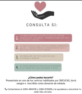 Ser donante de médula ósea es salvar vidas en vida, es muy importante saber que se puede ser donantes voluntarios no emparentado. Una vez que el donante se registra queda registrado para ser donante de aquí en adelante para toda persona que necesite, ya que se puede donar en cualquier lugar del mundo.
