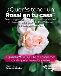 Este viernes, de 10 a 15 horas, la Dirección de Espacios Verdes del municipio estará entregando gajos de rosales podados a los vecinos/as que deseen cultivar estas plantas en sus hogares. La actividad se llevará a cabo en Plaza San Martín y está abierta a toda la comunidad.