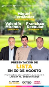 El precandidato a Intendente del Distrito de Trenque Lauquen de Juntos por el Cambio, Francisco Recoulat, presentará a los integrantes de la lista y el equipo que lo acompaña para las próximas elecciones PASO en un acto organizado en el subcomité de la UCR de 30 de agosto este próximo miércoles a las 20,30 horas.