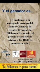 La Biblioteca Pública Rivadavia anunció que el próximo viernes 6 de octubre a las 18,30 dará a conocer a los ganadores del Primer Concurso de Relatos Breves “La Biblioteca es puro cuento”, organizado en el marco de los festejos por el 120º aniversario de la institución. Se trata de la primera edición de un certamen que pretende ganar cada vez más importancia, como una “marca registrada” de la institución y la ciudad.