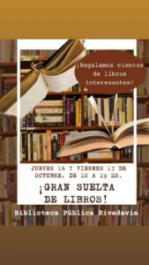 La Biblioteca Rivadavia anuncia una nueva suelta de libros para el jueves y el viernes próximo de 10 a 19 hs. La “suelta” consiste en regalar libros a los vecinos que se acercan a la institución y que solo tienen que elegir los títulos que les resultan atrayentes.