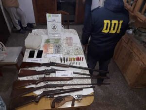 En total se secuestraron “9 armas de fuego (pistola bersa cal.22, revolver colt cal. 44/40, revolver s&w cal 32 tambor completo municiones, revolver antiguo cal. 38, carabina mahely cal.22 lr. rifle centauro cal 12, escopeta yuxtapuesta cal, 16, rifle cal. 14, rifle cal 14 s/marca, escopeta cal. 20. flota celulares última generación, prendas vestir, 1130 dólares americanos, 39.580 pesos argentinos”.