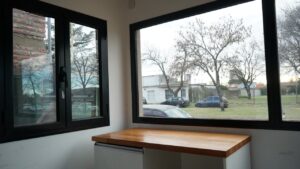 El techo será de chapa ondulada negra, con estructura metálica de perfiles galvanizados tipo “C”, aislación térmica y acústica, y cielorrasos de PVC tanto en interiores como en exteriores. Las puertas exteriores serán de aluminio y las interiores de placas de madera. El edificio contará con un baño completo, instalación eléctrica, conexión para cámaras de seguridad y red de internet.